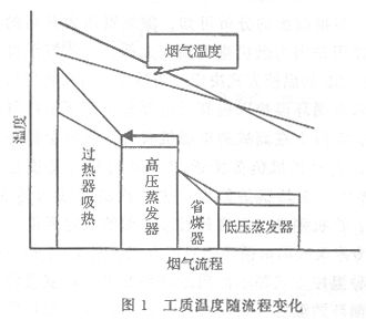 point),表示高壓蒸發(fā)器出口煙溫與汽包飽和溫度之間的傳熱溫差,工況變動時該傳熱溫差基本不變,當(dāng)燃機(jī)排氣溫度變化時燃?xì)鉁囟染撓D點轉(zhuǎn)動。排氣溫度降低時(圖中虛線所示),線越平坦,過熱器吸熱減少,省煤器及低壓蒸發(fā)器吸增加,排煙溫度升高,燃機(jī)排氣熱量利用程度低,反之亦然。運(yùn)行經(jīng)驗表明,當(dāng)燃機(jī)排氣溫度在426.7℃(800°F)以上時低壓蒸發(fā)器的吸熱能保證除氧器壓力在設(shè)計范圍內(nèi)。