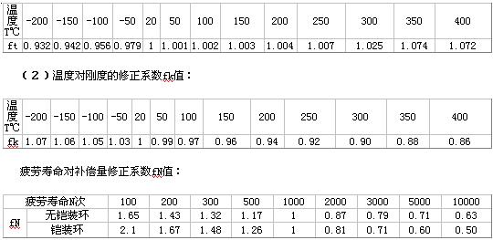 樣本中所列各種參數(shù),其設(shè)計條件是:溫度t=20℃,許用疲勞幫助[N]=1000次(外壓型[N]=100次。當(dāng)實際工作溫度T≠20℃,疲勞壽命N≠1000次時,須用溫度對補償量的修正參數(shù)ft、溫度對剛度的修正系數(shù)fk、疲勞壽命對補償量修正系數(shù)fN進行修正。即用樣本中的額定值乘上修正系數(shù)。