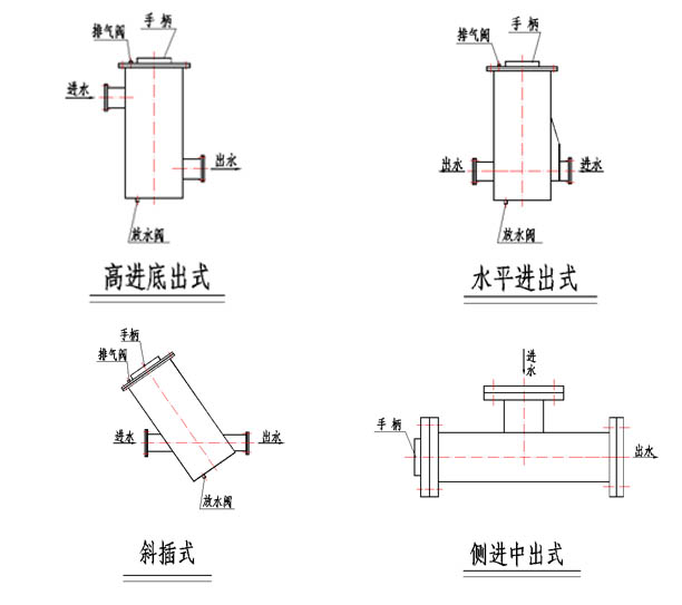 3. 確定濾水器安裝位置和安裝型式(如:高進(jìn)低出式,斜插式,側(cè)進(jìn)中出式等)。