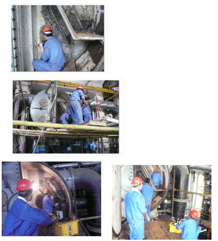 凝汽器(銅管)換裝不銹鋼管改造技術◆◆◆連云港市宏慶電力輔機開發(fā)有限公司換管技術◆◆◆換管工具齊全◆◆◆換管業(yè)務遍及全國各地◆◆◆深受新老客戶好評! 凝汽器是汽輪發(fā)電機組重要的冷卻源設備,凝汽器冷卻系統(tǒng)的水源來于江河、湖泊、大海。近幾年我國江河、湖泊、大海的水源污染嚴重,使凝汽器冷卻管腐蝕速度加劇,凝汽器頻繁發(fā)生冷卻管泄漏,嚴重影響發(fā)電機組的正常運行。特別是銅管易受到氨離子、硫化物等的腐蝕,久而造成冷卻管泄漏,從生產工藝上講,銅管內壁不光滑易附著微生物及各種污垢,使銅管的使用壽命大大降低。連云港市宏慶電力輔機開發(fā)有限公司一直從事◆◆◆凝汽器改造◆◆◆凝汽器換管◆◆◆凝汽器(銅管)換裝不銹鋼管改造,在長期的換管實踐中,總結出一套成熟的換管技術工藝,凝汽器(銅管)換裝不銹鋼管改造◆◆◆凝汽器換管◆◆◆冷油器換管◆◆◆高加加熱器換管技術國內處于地位。 凝汽器(銅管)換裝不銹鋼管改造技術工藝◆◆◆管板孔現(xiàn)場開槽脹接(銅管無須開槽,直接脹接),保證換熱管拉脫力達到1000kg以上;管板及管板孔恢復如新,管板孔無毛刺;合適的脹管率,即無欠脹又無過脹,保證脹口長期不松動、無泄漏;獨立開發(fā)系列專用換管工具;成熟豐富的現(xiàn)場換管經驗;經過專業(yè)培訓的換管隊伍;高質量、高效率、短周期完成施工任務。