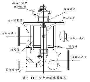 同時(shí)要求可以進(jìn)行分散控制系統(tǒng)(DCS)遠(yuǎn)程操作、現(xiàn)場(chǎng)就地自動(dòng)操作、現(xiàn)場(chǎng)手動(dòng)操作和現(xiàn)場(chǎng)機(jī)械手動(dòng)操作等。其自動(dòng)清污、排污是在線進(jìn)行,不影響機(jī)組正常供水。為完全實(shí)現(xiàn)電廠提出的“無人值班”(少人值守)要求,濾水器需達(dá)到全自動(dòng)、免除人工清洗,保證能在較長(zhǎng)時(shí)間無維修、無檢查的條件下正常工作,而且還應(yīng)具有定時(shí)運(yùn)行、高差壓自動(dòng)反洗、遠(yuǎn)程DCS控制、人工就地自動(dòng)操作、就地手動(dòng)操作、故障報(bào)警和手/自動(dòng)切換等多種功能,以滿足不同工況下對(duì)供水排污的要求。其結(jié)構(gòu)如圖1所示。